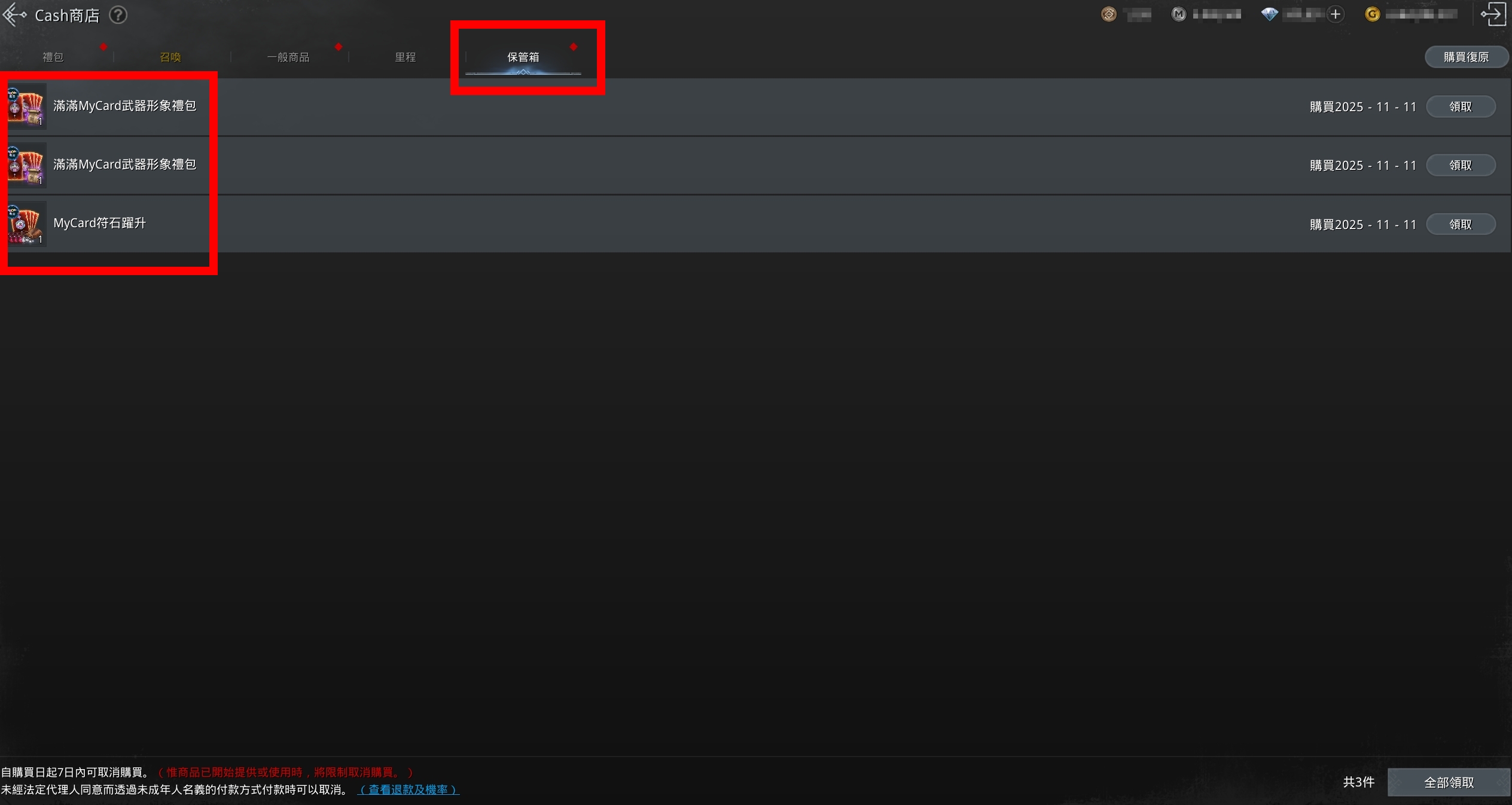 – 購買的商品以發送至保管箱, 請點擊右側[領取]或下方的[全部領取],即可領取。(PC/手機遊戲內皆可領取。)